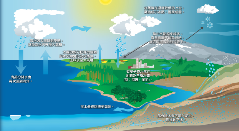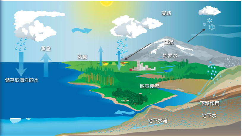 熱能主要通過蒸發(fā)及蒸騰作用,以潛熱形式離開,以及通過地面輻射散逸。水分通過蒸發(fā)、蒸騰作用、以及徑流等過程而離開。徑流runoff 指所有離開河盆的流水,由地表流、河川、表層流及地下水流共同組成。河水搬運(yùn)的物質(zhì),亦會(huì)隨著河水而進(jìn)入湖泊或海洋。